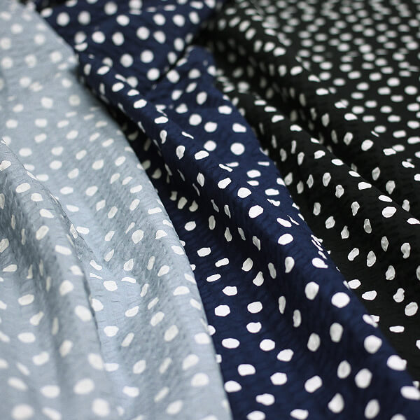 こんなドット柄のリップル生地も可愛い。リップル生地は、生地の表面に凸凹があるので夏でも肌にべとつかずサラッと着れる服が出来上がります。